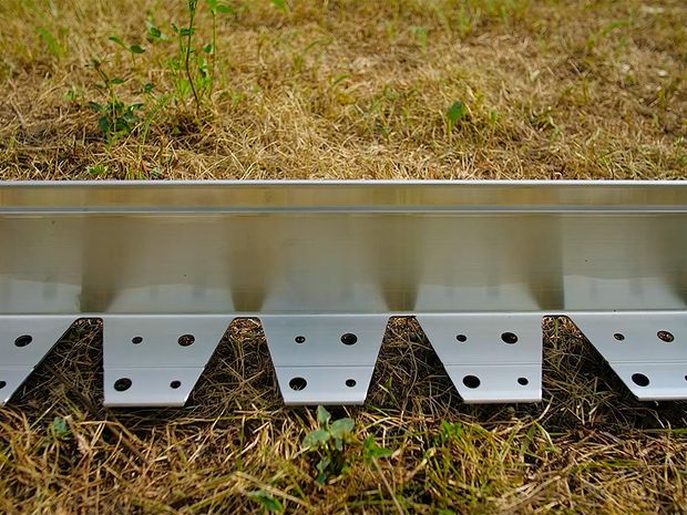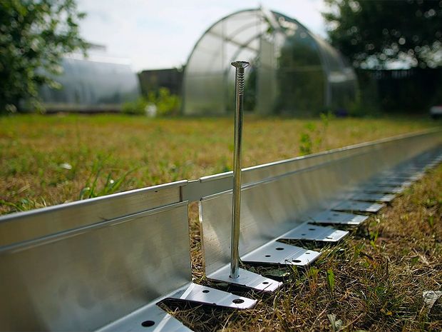 Толщина 3 мм. Один бордюр длиной 250 см. Ширина основания 7,6 см. Высота 10 см. Секции бордюра соединяются между собой соединительным элементом, который поставляется в комплекте. Производится из высококачественного, 100% перерабатываемого алюминиевого сплава.
