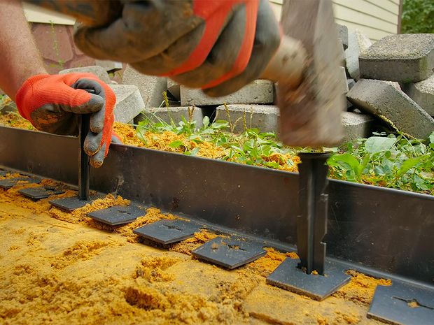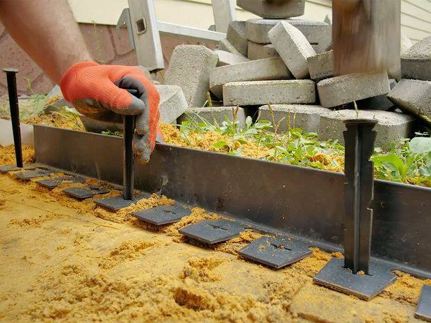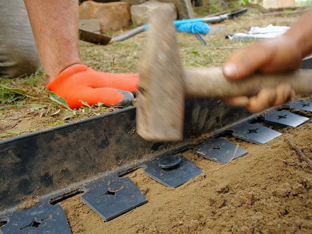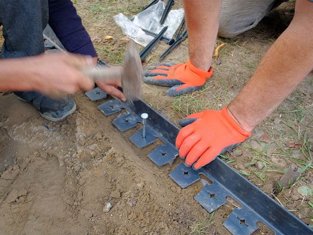 Для крепления бордюра используйте пластиковые колышки или стальные гвозди. Для твердого и каменистого грунта используйте стальные гвозди длиной 25 см. Для мягкого грунта лучше применять пластиковые колышки. 3 крепежа на один метр бордюра, если линия установки прямая и 5 крепежей, если линия установки содержит изгибы. В месте соединения 2-х секций бордюра оставьте 3-5-миллиметровый зазор. Данный зазор необходим, для создания пространства для расширения бордюра в случае резкого изменения температуры окружающей среды.