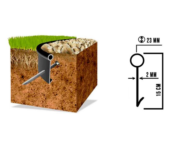 Для крепления бордюра в грунте используйте стальные или пластиковые якоря как показано на рисунке. Для предотвращения выдавливания из земли рекомендуется использовать 8-10 крепежных якорей на 10 метров бордюра.