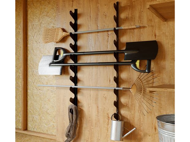 Конструкция позволяет размещать предметы разного типа: лопаты, грабли, мотыги, мелкий садовый инструмент, хозяйственные мелочи, швабры, вёдра, верёвки и пр.