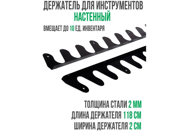 Настенный держатель для организации аккуратного, компактного хранения садового инвентаря и хозяйственных инструментов. Позволяет разместить 10 единиц инвентаря. Изделие состоит из двух кронштейнов, которые крепятся на стене параллельно друг другу. Материал – металл 2мм, покрытие – порошковая краска шагрень. Длина кронштейна 118 см. Габариты упаковки: 119 см*12см*3см, вес 2,37кг