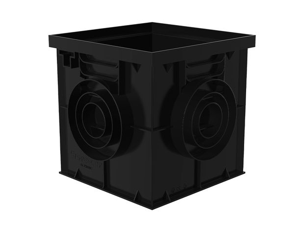 Прямоугольная конструкция оснащена патрубками и шаблонами для монтажа труб и лотков. На верхней части расположены ответные пазы для фиксации защелок решетки. Отводы для труб расположены по всем стенкам. Возможно подключение пластиковых трубопроводов раструбной и фасонной частью. При необходимости дождеприемники располагаются друг над другом, что увеличивает вместительность колодца. В комплектующих предусмотрены специальные перегородки-сифоны, которые задерживают неприятный запах. Это позволяет владельцам дач или коммунальным службам увеличить интервал обслуживания системы.