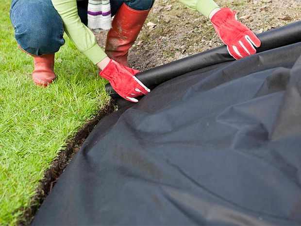 - Сделать срез земли необходимой глубины. Геотекстиль уложить на дно углубления, края полотна загибаем вверх на высоту слоя плодородного грунта. Сверху засыпать грунт, щебень, песок или декоративную отсыпку.