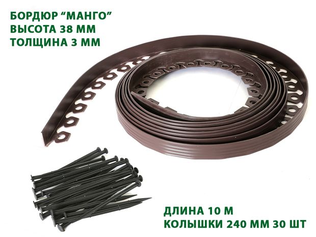 Садовый пластиковый бордюр ГеоПластБорд "Манго", высота 38 мм, 10 метров + 30 кольев, коричневый