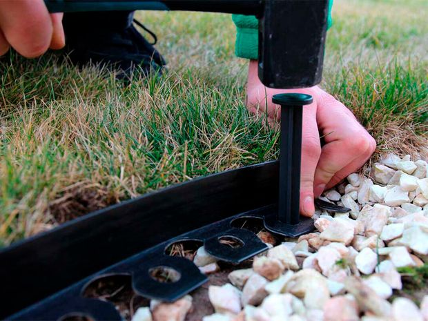 Пластиковый колышек забивается в грунт с помощью резинового или деревянного молотка.