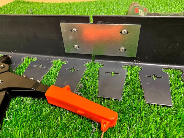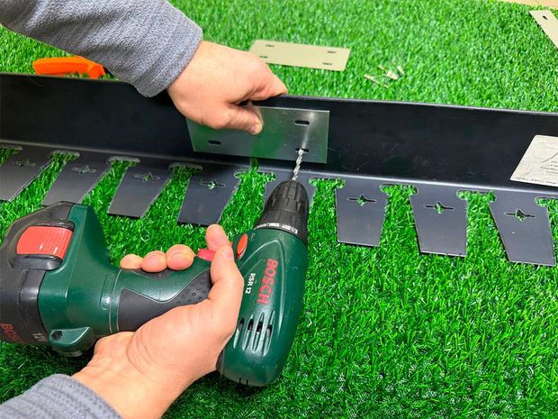 Для соединения двух бордюров понадобится один комплект соединителей, шуруповёрт со сверлом, заклёпочник.