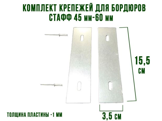 В комплект соединителей входит две металлические пластины толщиной 1мм и две вытяжных заклёпки. Соединители предназначены для соединения двух секций бордюра Стафф высотами 45мм или 60мм. В месте соединения 2-х секций бордюра оставьте 3-5-миллиметровый зазор. Данный зазор необходим, для создания пространства для расширения бордюра в случае резкого изменения температуры окружающей среды. Соединители необходимы при прямой и радиусной укладке бордюров, чтоб зафиксировать место соединения секций.