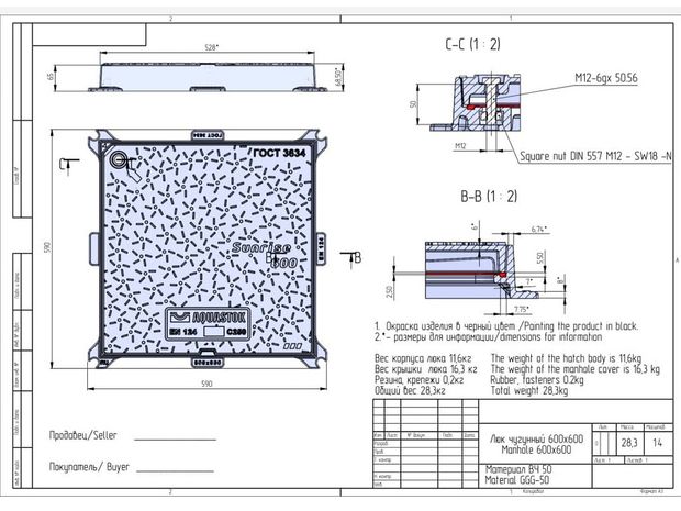 Люк чугунный квадратный габарит 590мм, H65мм, вес 29 кг
