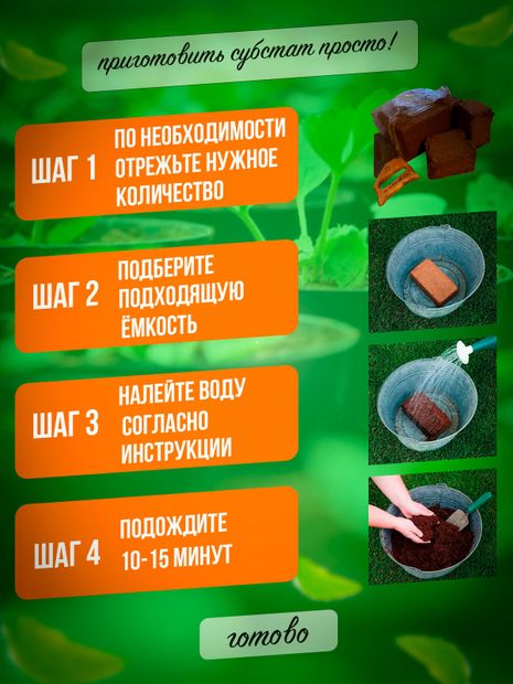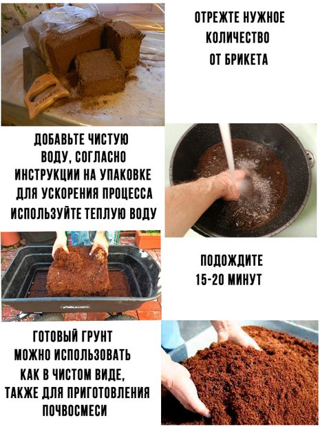 Для получения готовой растительной среды поместите брикет в емкость достаточного объема и постепенно добавляйте теплую воду.