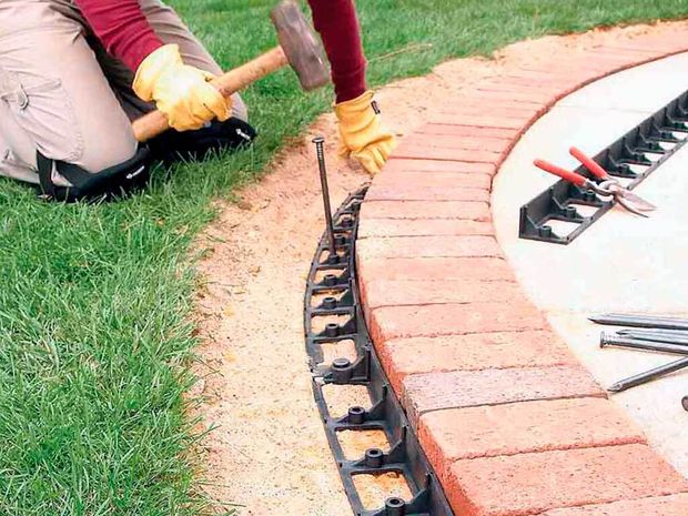 Поребрик прибивают к грунту пластиковыми колышками или металлическими гвоздями: