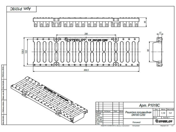 Класс нагрузки А15 В125 С250, Ширина гидр.сечения - DN100, Длина 499 мм, Ширина 139 мм, Высота 44 мм
