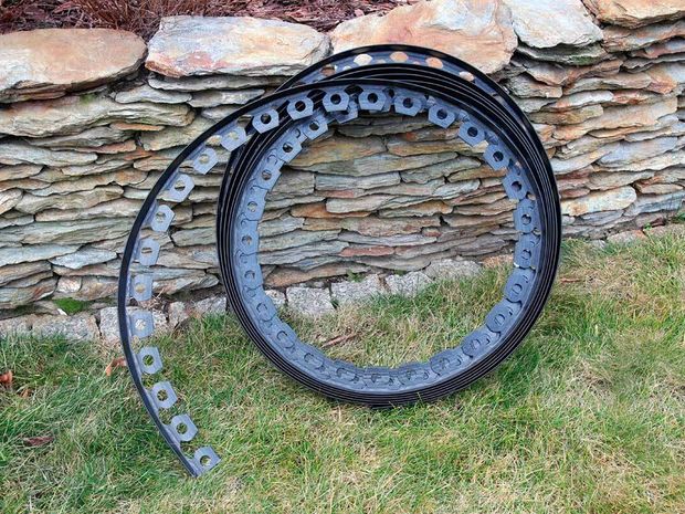 Установите бордюр, прибив его к земле кольями, входящими в комплект, предварительно отрезав нужную длину ножовкой или ножницами по металлу.