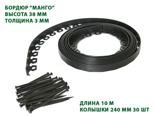 Садовый пластиковый бордюр ГеоПластБорд Манго, высота 38 мм, в комплекте с 30 крепёжными кольями. Цвет может меняться от партии к партии от черного до графитового (темно-серого).