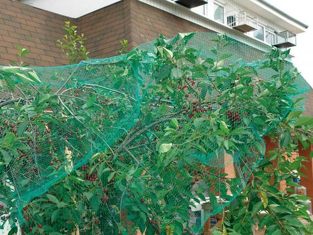 Урожай вишни, черешни, груши, персика позволит сохранить нетронутым сетка для защиты деревьев от птиц. Ее заблаговременно набрасывают на крону, закрепляют на стволе. Можно сделать это еще в период цветения: размер ячейки не мешает опылению цветов. Когда появятся сочные плоды, птички не смогут подлететь к ним и сесть на ветки, чтобы полакомиться вашим урожаем.