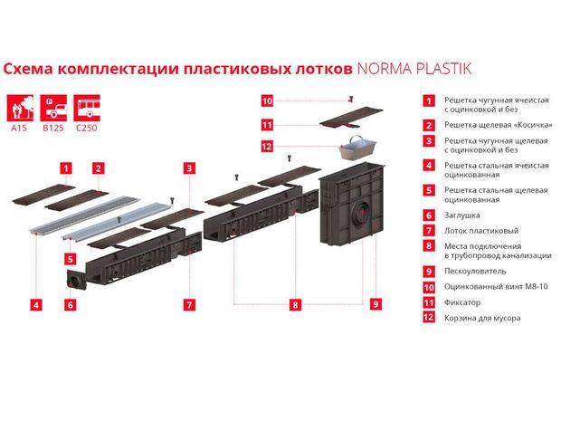 – при классах нагрузки А15–С250, стыки между лотками заполняются эластичным